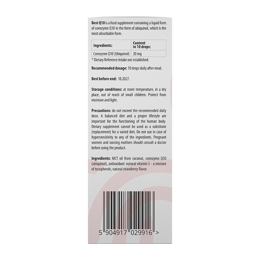 BestQ10 is a modern, liquid dietary supplement providing Coenzyme Q10 in the form of ubichinol – the reduced, highly bioavailable and active form of Q10 with a natural strawberry flavor. Coenzyme Q10 is naturally present in every cell, especially in tissues with high energy demands, such as the heart, muscles, and liver. It plays a key role in the mitochondrial electron transport chain, supporting ATP production, and also functions as an antioxidant, helping to neutralize excess free radicals.